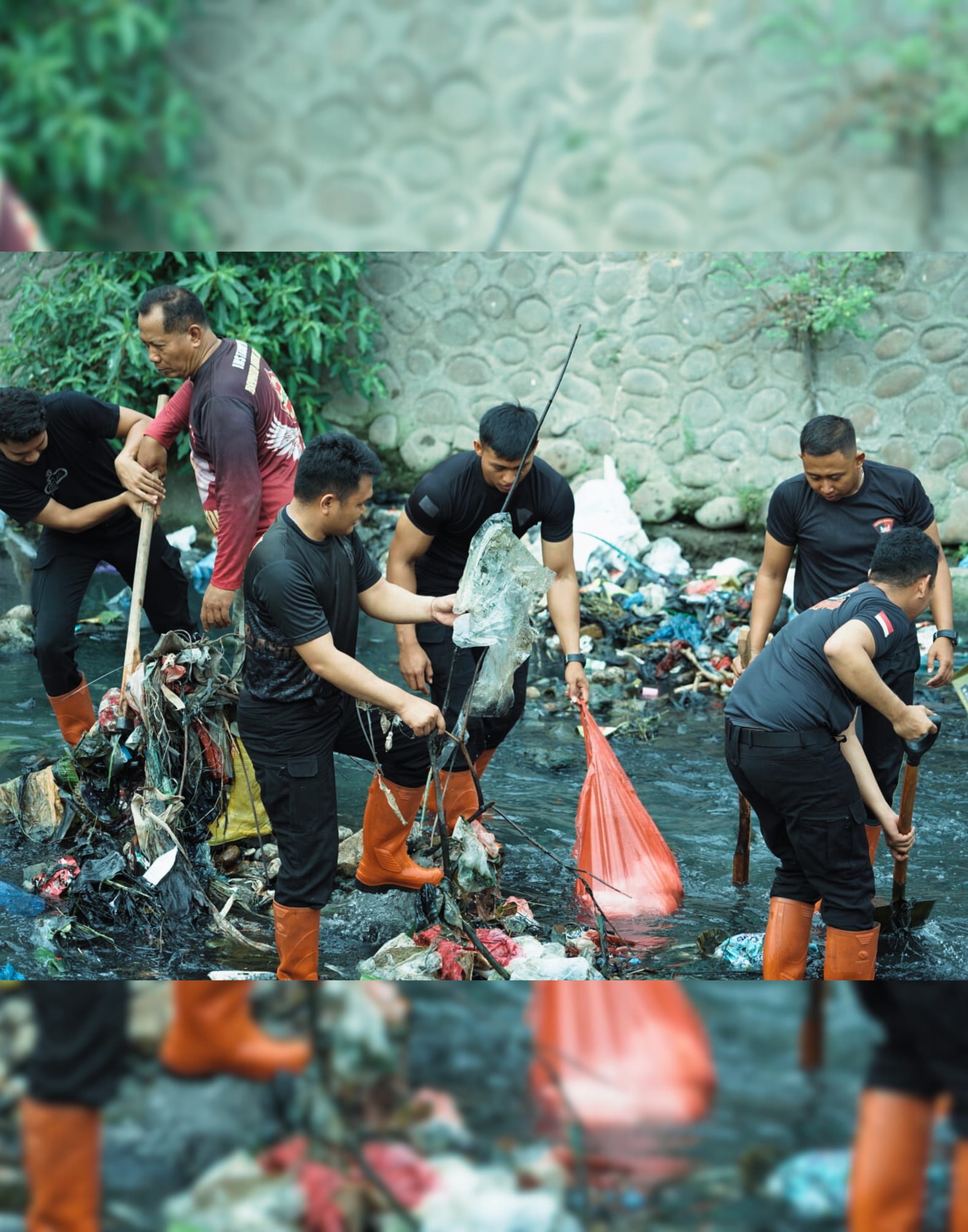 Dengan semangat gotong royong dan pengabdian tanpa pamrih, personel Brimob bahu-membahu membersihkan tumpukan sampah yang mengendap di sekitar aliran sungai. Sampah-sampah yang berpotensi menyumbat aliran air diangkat satu per satu agar sungai kembali bersih, sehat, dan mengalir lancar.