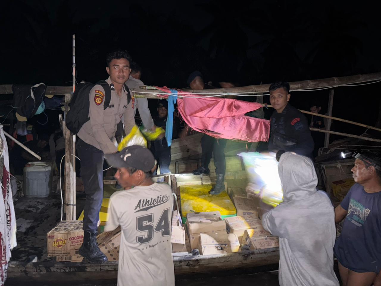 KAPOLRES LANGKAT SALURKAN BANSOS UNTUK KORBAN BANJIR DI PEMATANG JAYA MELALUI JALUR LAUT