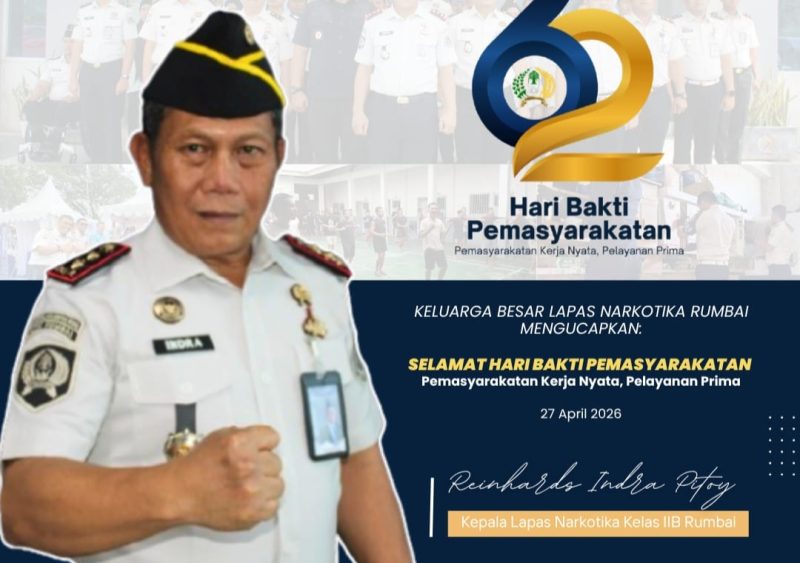 Pekanbaru |Risatu.com| Dalam rangka memperingati Hari Bakti Pemasyarakatan ke-62 yang jatuh pada 27 April 2026, Keluarga Besar Lembaga Pemasyarakatan (Lapas) Narkotika Rumbai menyampaikan ucapan selamat sekaligus menegaskan komitmen dalam meningkatkan kualitas pelayanan kepada masyarakat.
