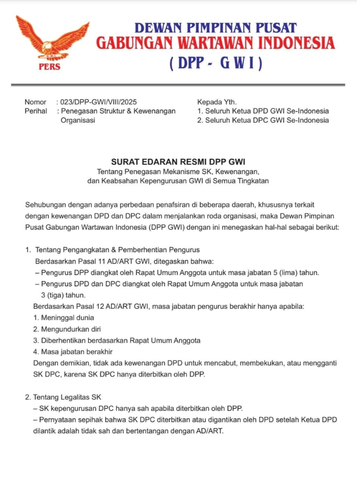 “Surat Edaran itu jangan justeru memicu kegaduhan dan konflik di internal GWI, kita tetap satu Komando, Pelayanan Satu Pintu. Yang sudah berjalan dengan baik selama ini yaitu, DPP menerbitkan SK dan KTA DPD dan DPC. Kemudian DPD menerbitkan SK DPC. Sedangkan urusan Baju Dinas, DPP memberikan kewenangan kepada DPD dan DPC membuat sendiri, itu yang sudah berjalan dengan baik selama ini. Lalu apa yang dimaksud DPP terjadi Dualisme?