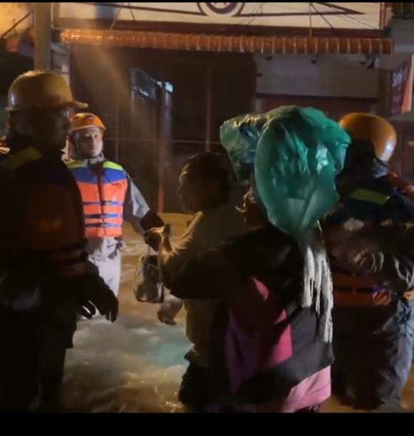 Saat personel tiba di lokasi, air sudah menggenangi jalan-jalan utama dan rumah-rumah warga. Suara deras arus bercampur dengan teriakan warga yang meminta pertolongan. Di beberapa titik, aliran air sangat dekat dengan parit besar, membuat situasi semakin rawan terseret arus.