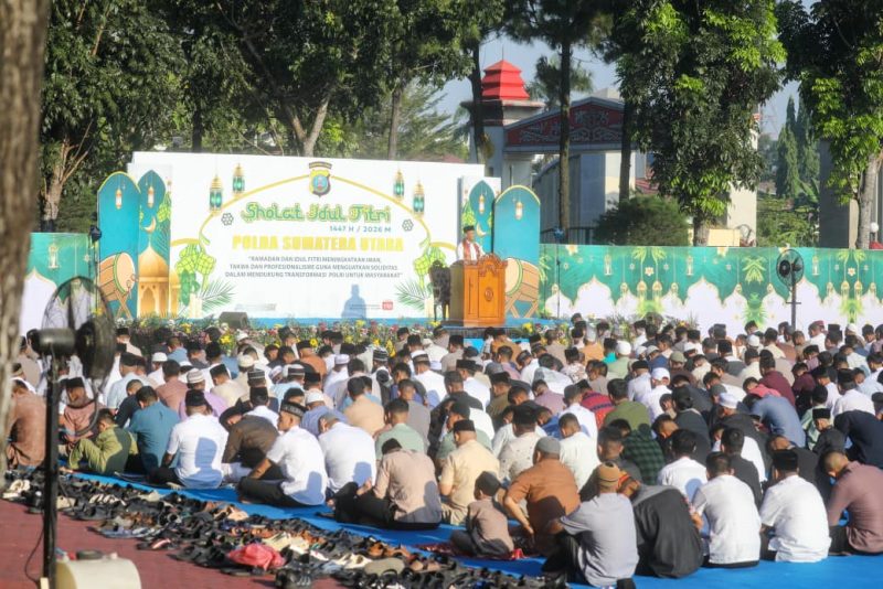 MEDAN | RISATU.COM – Kepolisian Daerah Sumatera Utara (Polda Sumut) menggelar Shalat Idul Fitri 1447 Hijriah/2026 Masehi dengan khidmat di lingkungan Mapolda Sumut sebagai momentum memperkuat keimanan, ketakwaan, serta profesionalisme dalam mendukung transformasi Polri yang presisi untuk masyarakat.