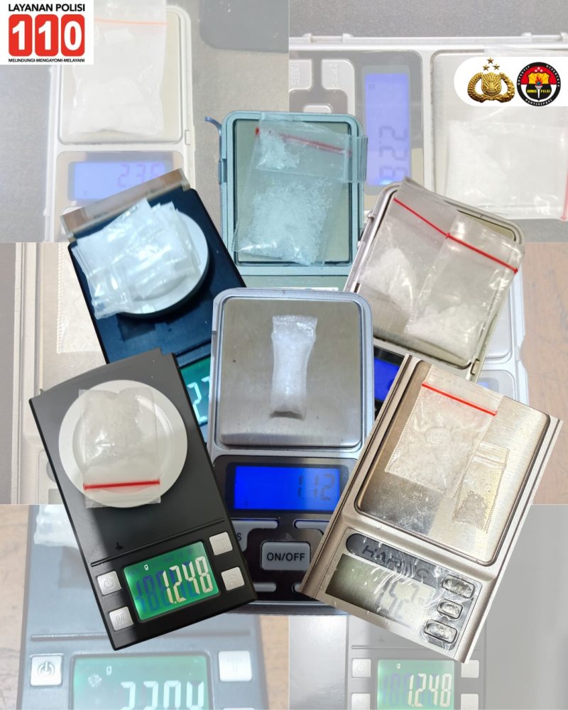 Dari kesebelas pelaku dengan sembilan TKP, ditemukan dan diamankan barang bukti berupa : ” sabu-sabu 12,8 gram, 1 butir ekstasi, uang tunai Rp. 293.000,-, HP 5 unit serta 2 unit sepeda motor.
