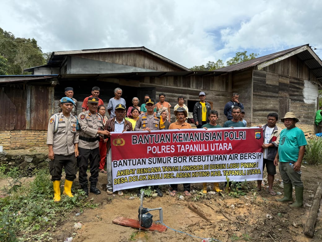 TAPANULI UTARA | RISATU.COM – Sebagai wujud kepedulian dan respons cepat Polri terhadap masyarakat terdampak bencana alam, Polda Sumatera Utara melalui Polres Tapanuli Utara membangun bantuan sumur bor air bersih di Dusun Lobu Pining I, Desa Dolok Nauli, Kecamatan Adiankoting, Kabupaten Tapanuli Utara. Bantuan kemanusiaan ini diberikan menyusul bencana tanah longsor yang sempat mengganggu akses dan ketersediaan air bersih bagi warga setempat.