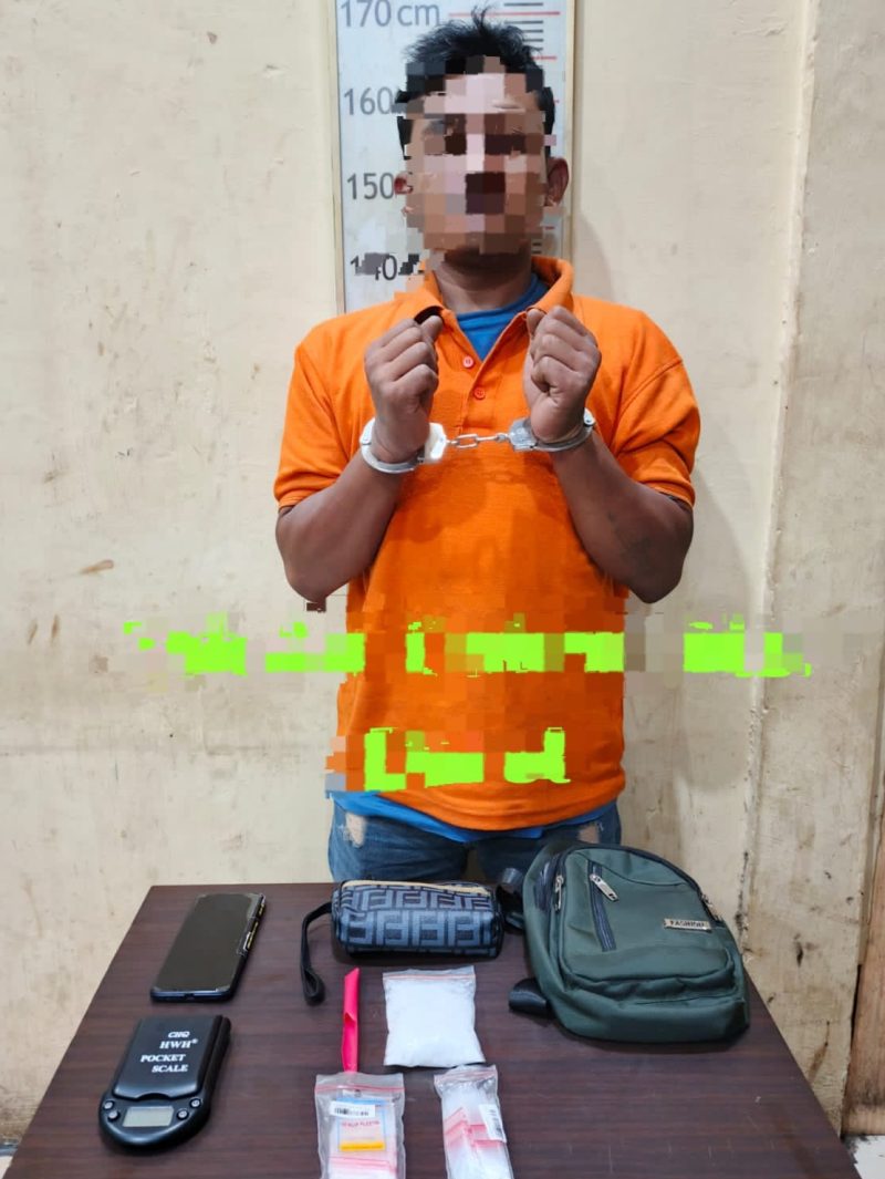 Selain itu turut diamankan 1 unit timbangan elektrik, 2 bal plastik klip bening kosong, 1 dompet warna batik, 1 unit handphone Oppo warna hitam, 1 sekop yang terbuat dari pipet plastik, serta 1 tas sandang samping warna hijau.